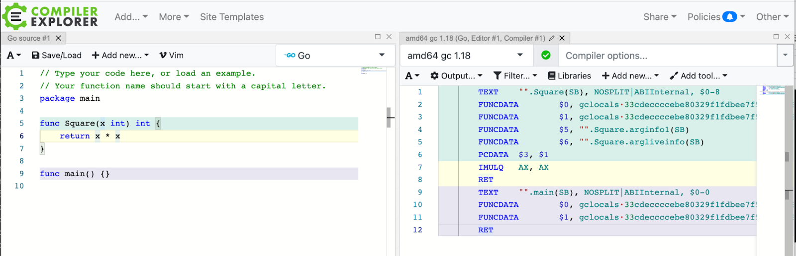 My story starts on a weekend when I was doing a bunch of tiny optimizations to the Gio UI project. There are ways to view the assembly; one is to use go tool objdump -s funcname from the command line. However, it's rather difficult to see how the source code and assembly are related.
